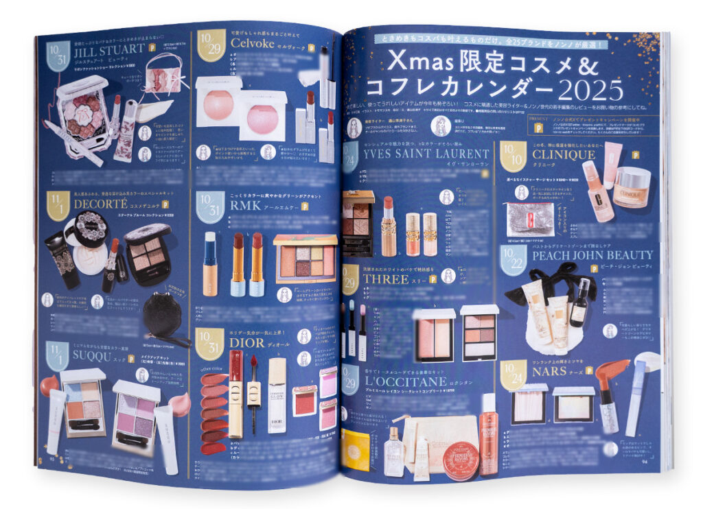 Homeclient works集英社 non-no 2025年12月号 P.94-97「Xmas限定コスメ&コフレカレンダー2025」 集英社『non-no』2025年12月号 P.94-97「Xmas限定コスメ&コフレカレンダー2025」特集にて、スタッフさまの似顔絵を描かせていただきました。 WEBサイトの方でも似顔絵アイコンを使用していただいています。 参考クリスマスコフレ2025 の記事一覧 | non-no webnon-no web